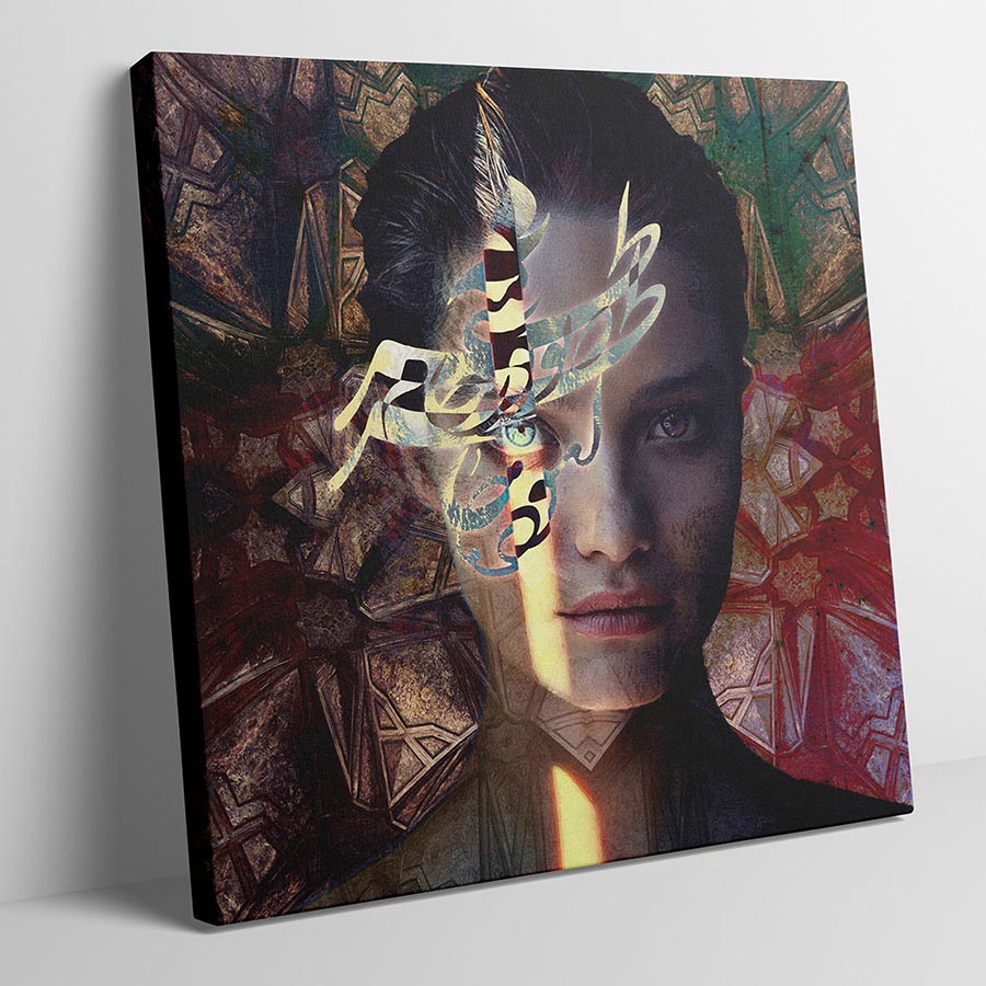 تابلوی نقش رخ ماهرو با نگاهی پر تمنا در دایرهٔ ماه و ستارهٔ خلقت از گالری چارگوش مدل 2582