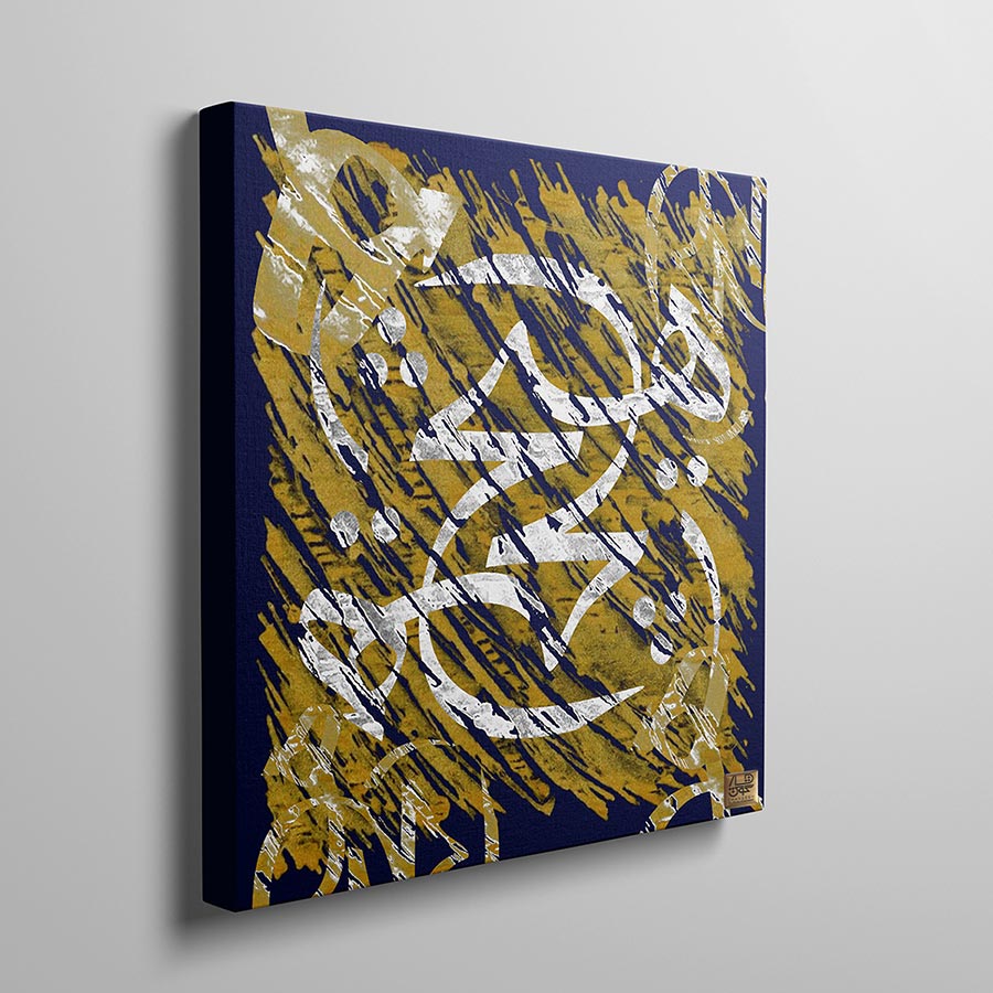 تلفیق با مبلمان و اکسسوریها: این اثر به دلیل داشتن بافتِ خشن و گرانج در کنارِ خوشنویسیِ ظریف، به زیبایی با متریالهای متفاوتی ست میشود. قرار گرفتن این تابلو در بالای یک کاناپه با پارچهی مخملِ خاکستری یا سرمهای، حسی از تجملِ مدرن را القا میکند. همچنین، به دلیل ضربات قلمموی طلایی، استفاده از اکسسوریهایی از جنس برنج، مسِ اکسید شده یا ظروفِ سرامیکی با لعابهای متالیک در نزدیکیِ تابلو، هارمونیِ بینظیری ایجاد میکند. اگر فضای شما مینیمالیستی است، این تابلو به تنهایی میتواند بارِ معنایی و بصریِ اتاق را به دوش بکشد.