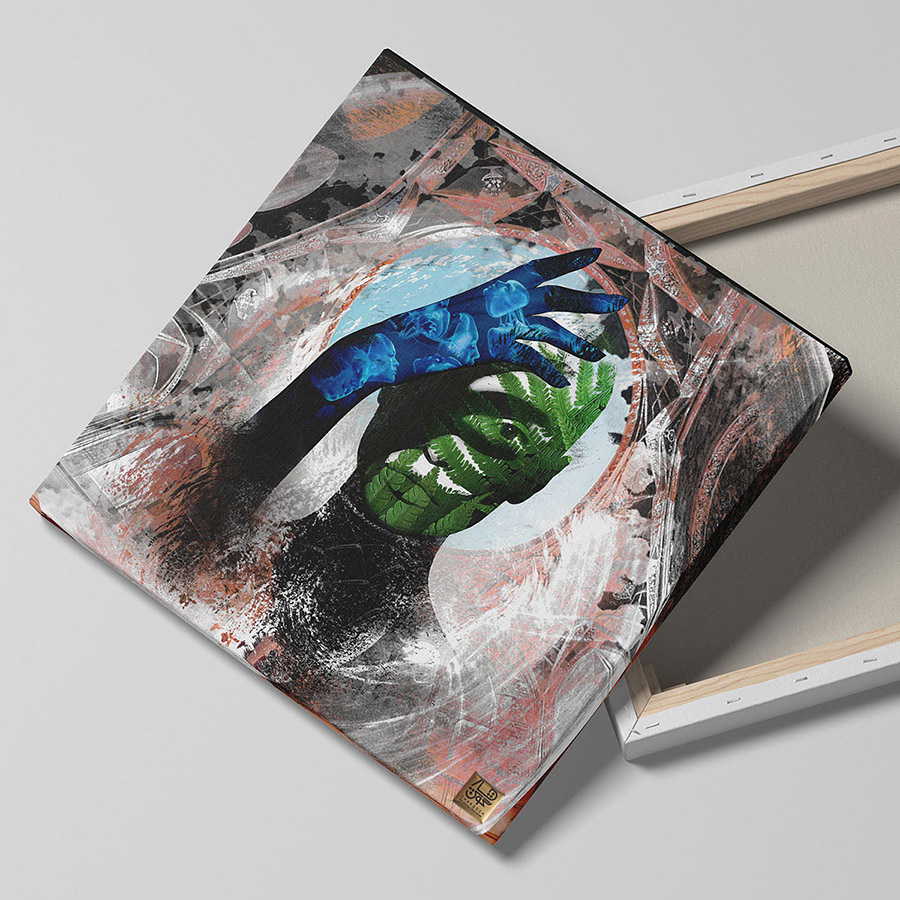 تکنیک: کلاژ مفهومی دیجیتال و شفافیت لایهای | چاپ: جیکلی ۱۲ رنگ روی کانواس نانو | بافت: تلفیق زبری سنگ مقرنس و لطافت ژلاتینی عروس دریایی | طراح: احمد قلیزاده