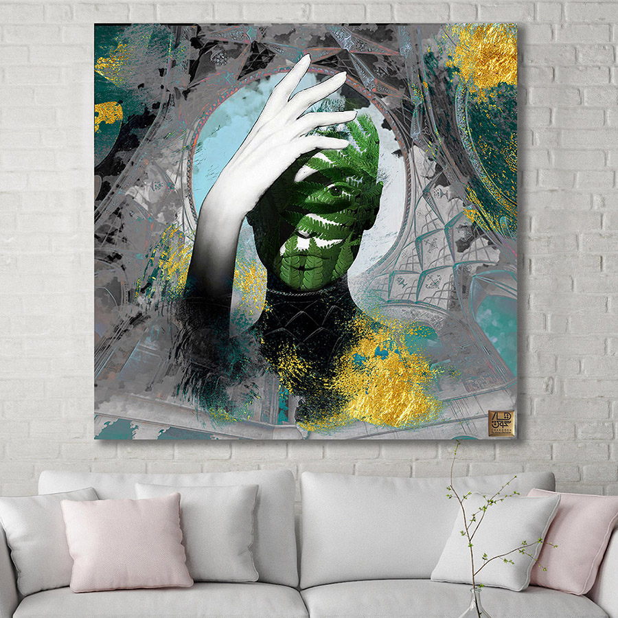 هارمونی با مبلمان: این تابلو با مبلمانِ مینیمال و مدرن به خوبی جفت میشود. کاناپههایی با پارچههای کتان یا مخمل در طیفهای کرم، سدری (برای هماهنگی با سرخسها) یا طوسی، بهترین انتخاب هستند. اگر در فضا از متریالهای طبیعی مثل چوب بلوط یا فلز مس استفاده کردهاید، تابلوی «ماورای حادثه» پیوندِ تمام این عناصر را در محیط برقرار میکند.