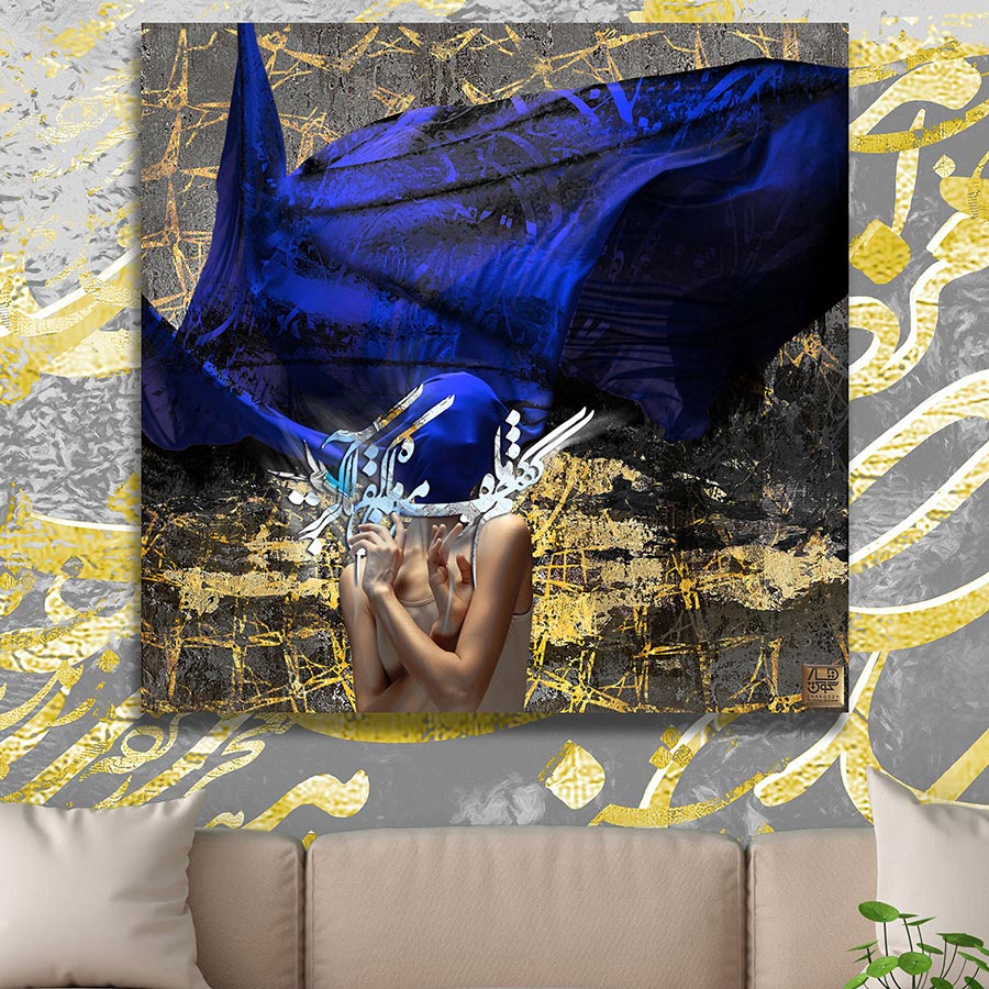 وضعیت فیگوراتیو بانو، با دستهایی که در نزدیکی صورت قرار گرفتهاند، حسی از «مراقبه و احترام» را القا میکند. این فرم بدنی، مخاطب را به سکوت و تامل وا میدارد؛ گویی اثر از ما میخواهد که برای لحظهای بایستیم و در پسِ پردههای زندگی، به دنبال معنایی عمیقتر بگردیم. پوشانده شدن صورت با پارچه، اضطرابِ ناشی از قضاوتهای سطحی را کاهش داده و ذهن را به سمت «زیباییِ درونی» و «خیالِ معشوق» سوق میدهد. درخششِ اثیری کلمات روی پوست، حسی از تقدس و امنیتِ روانی را منتقل میکند؛ گویی کلام حافظ مانند یک حصار نوری، از روحِ سوژه محافظت مینماید. این تابلو در فضای خانه، اتمسفری از وقار، متانت و عشقِ نجیب را حاکم میکند که به کاهش تنشهای روزمره و جایگزینی آنها با نوعی «حیرتِ مقدس» منجر میشود.